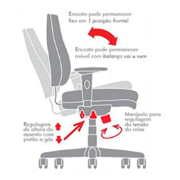 A Cadeira Diretor Sistema Relax Com Braço Corsa é equipada com o sistema Relax, que permite a reclinação sincronizada do encosto e do assento, garantindo uma posição confortável durante longos períodos de uso. Este sistema inclui ajuste de tensão da mola, operado por um manípulo frontal injetado, que permite ajustar a resistência conforme a preferência do usuário. O mecanismo giratório com regulagem de altura e sistema de amortecimento a gás assegura ajustes suaves e precisos, enquanto os rodízios facilitam a movimentação.